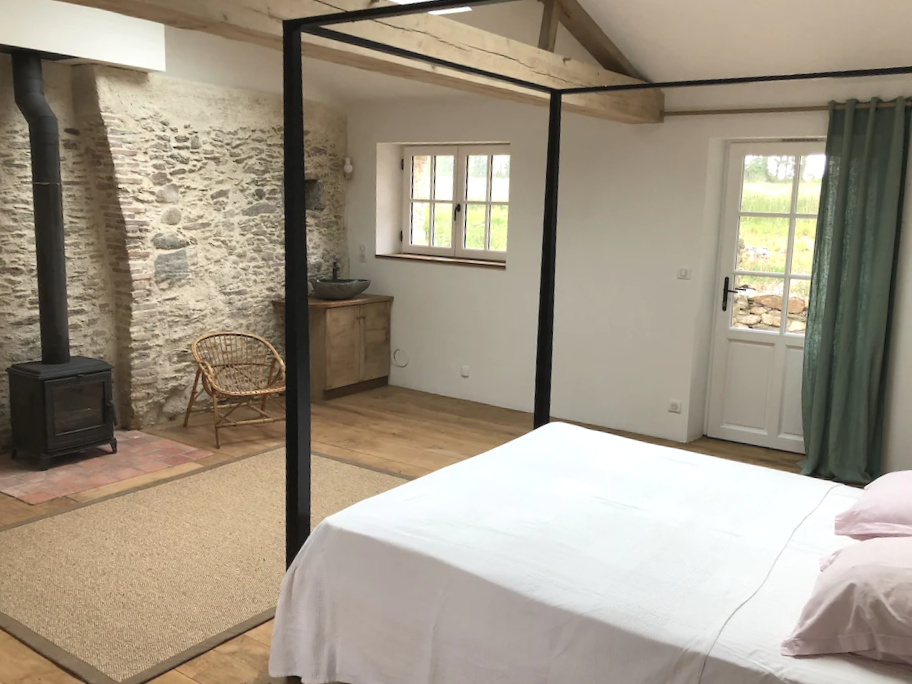 Poutres apparentes en chêne sur parquet avec lit baldaquin 1.60